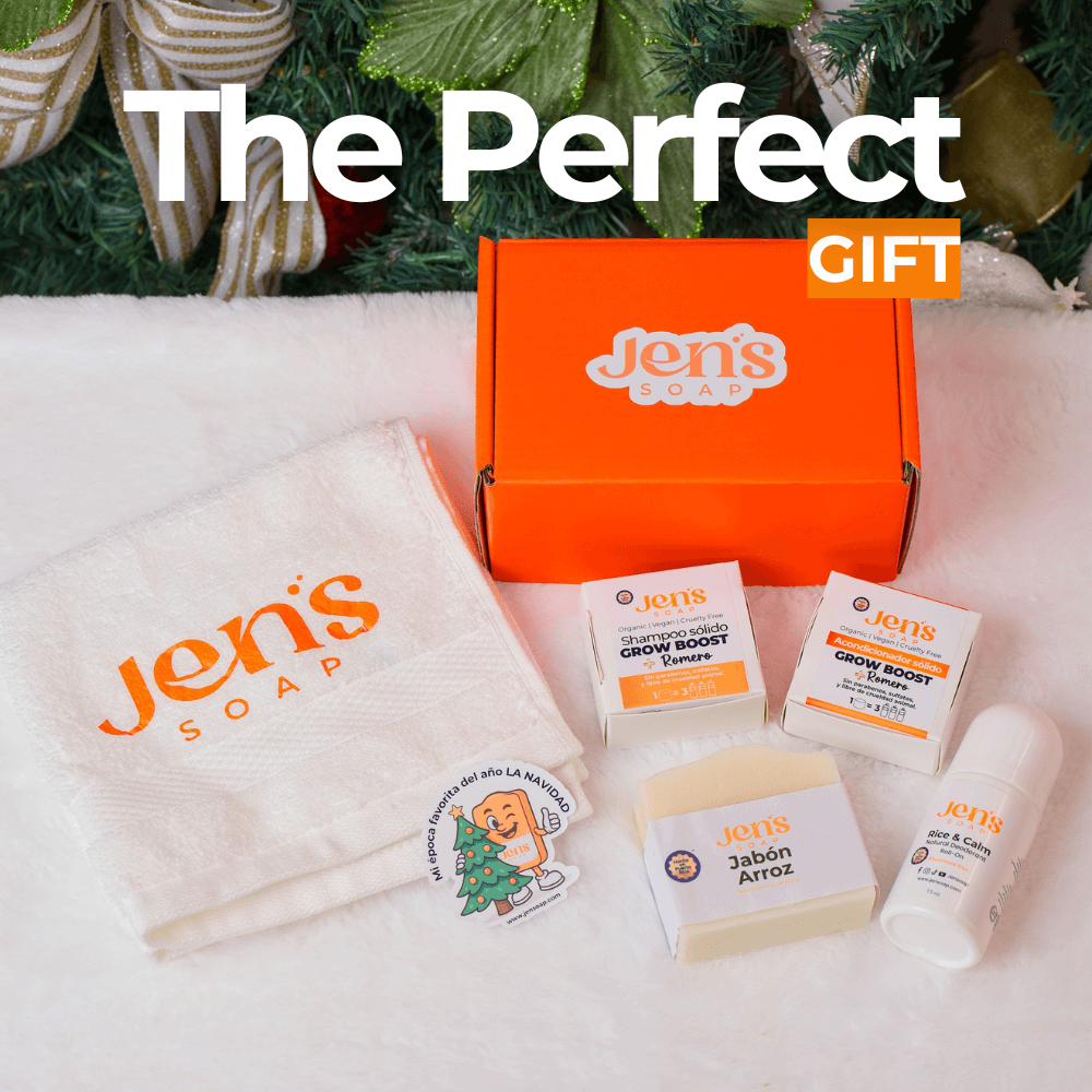 Incluye Jabón de Arroz, Desodorante sin aluminio, Mini Combo Shampoo y acondicionador sólido y una toallita Jens.